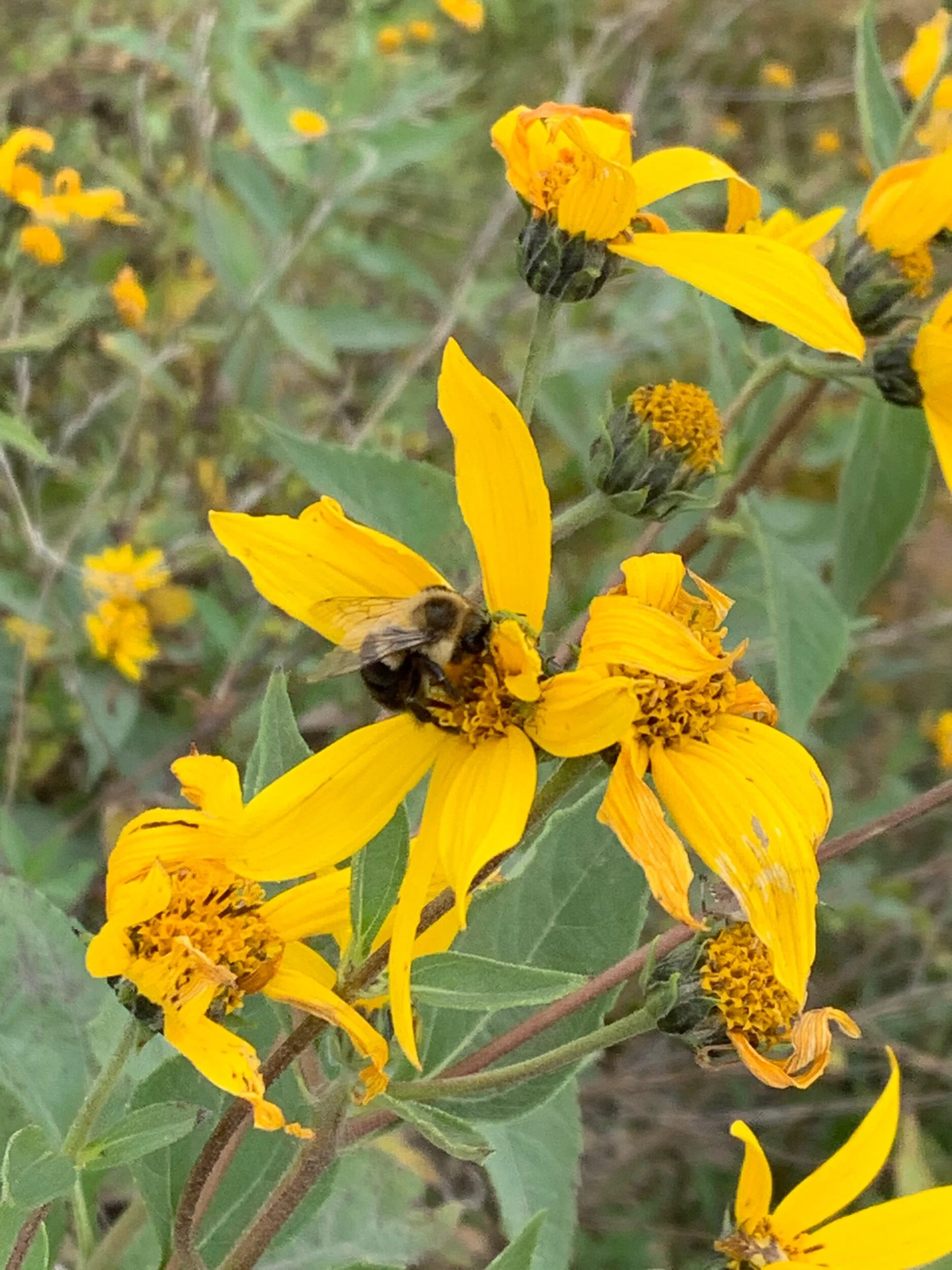 Along a little crick there was a patch of false sunflowers. A closer look yielded some nature underway.